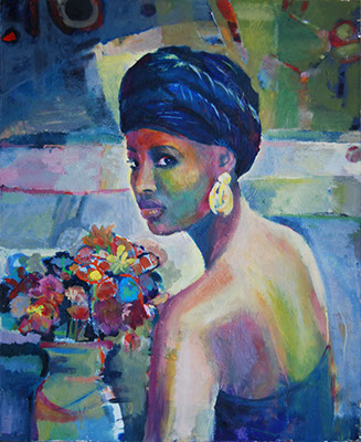Donna con turbante blu e vaso di fiori, tecnica mista su tavola, 54,5 x 44,8cm